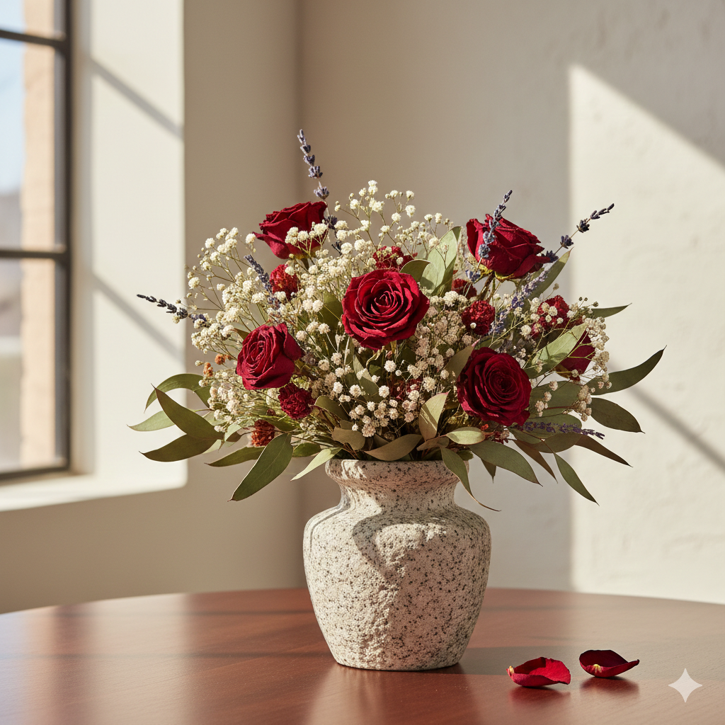 While a sun-drenched room looks beautiful, direct UV rays will act as a natural bleach on your flowers. To keep the deep, rich tones of The Crimson Eternal from fading into a dusty pink, style them in a spot that enjoys indirect light rather than a direct window sill.