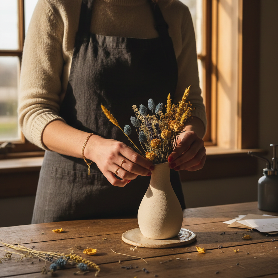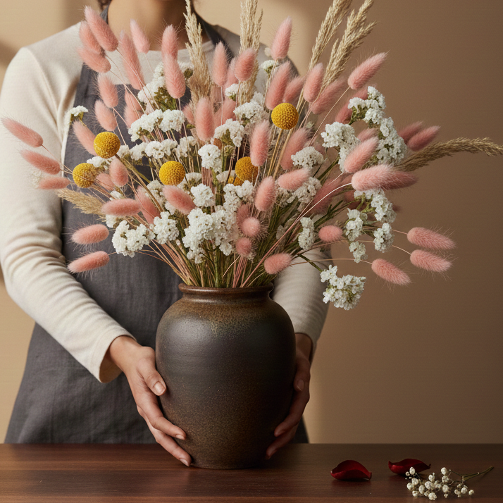 Before you unwrap your stems, choose their "forever home." Dried flowers thrive on stability. Because they become more brittle over time, frequent moving can cause delicate petals to shed. Pick a spot—a mantel, a bedside table, or a shelving unit—and let them settle in.